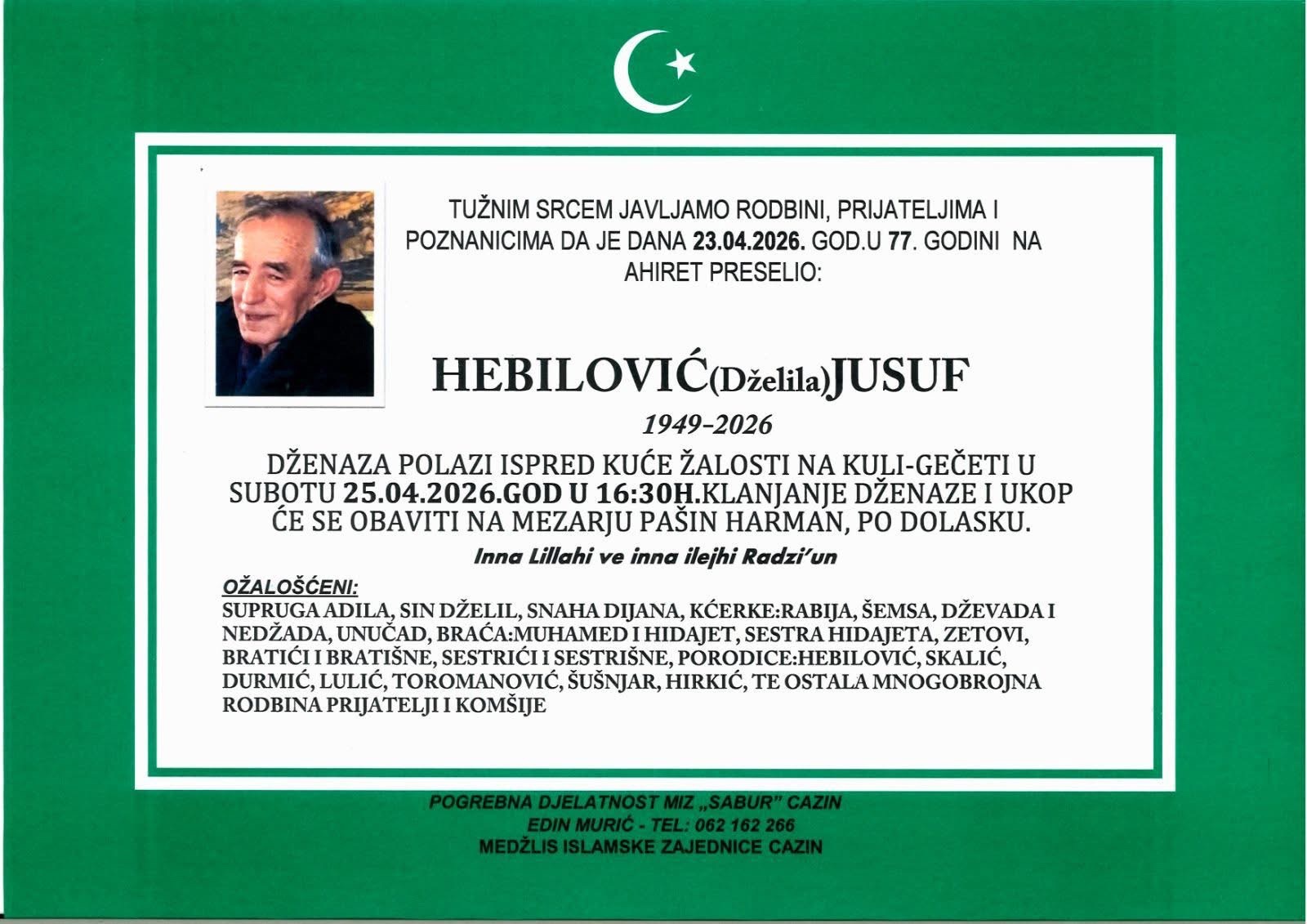 Dženaza polazi ispred kuće žalosti na Kuli-Gečeti u subotu 25.04.2026. godine u 16:30 h. Klanjanje dženaze i ukop će se obaviti na mezarju Pašin Harman, po dolasku.