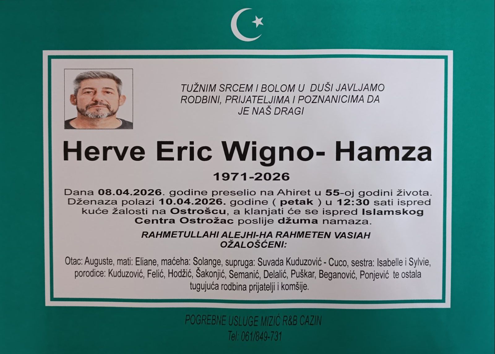 Dženaza polazi 10.04.2026. godine ( petak) u 12:30 sati ispred kuće žalosti na Ostrošcu, a klanjati će se ispred Islamskog Centra Ostrožac poslije džuma namaza.
