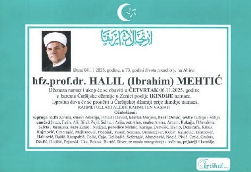 Dženaza namaz i ukop će se obaviti u ČETVRTAK 06.11.2025. godine u haremu Čaršijske džamije u Zenici poslije IKINDIJE namaza.