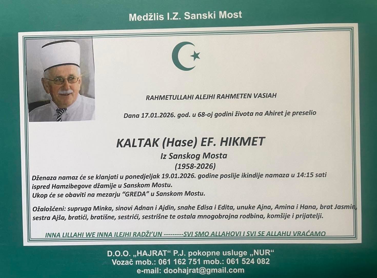 Dženaza-namaz Hikmet-ef. Kaltaku klanjat će se u ponedjeljak, 19. januara 2026. godine, poslije ikindije-namaza u 14:15 sati ispred Hamzibegove džamije u Sanskom Mostu, dok će se ukop obaviti na mezarju „Greda“.