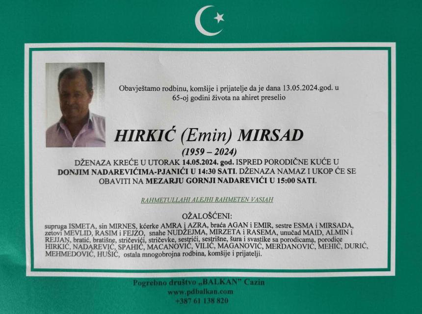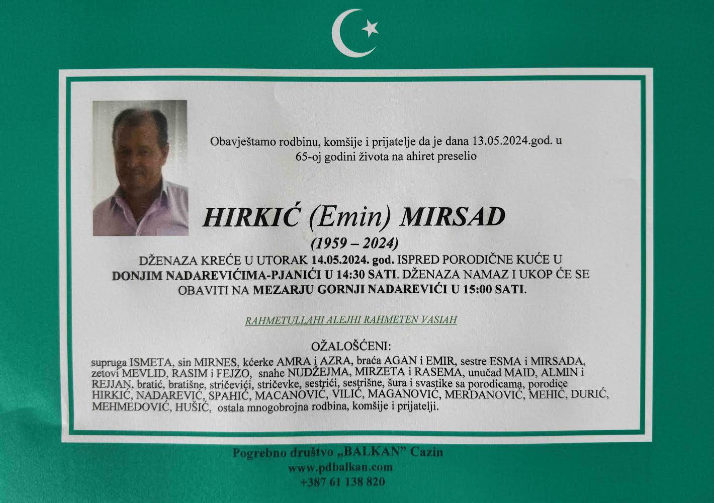 Tužnim srcem javljamo rodbini, prijateljima i komšijama žalosnu vijest da nam je naš dragi Hirkić (Emin) Mirsad dana 13.05.2024. godine u 65-oj godini života preselio na ahiret.