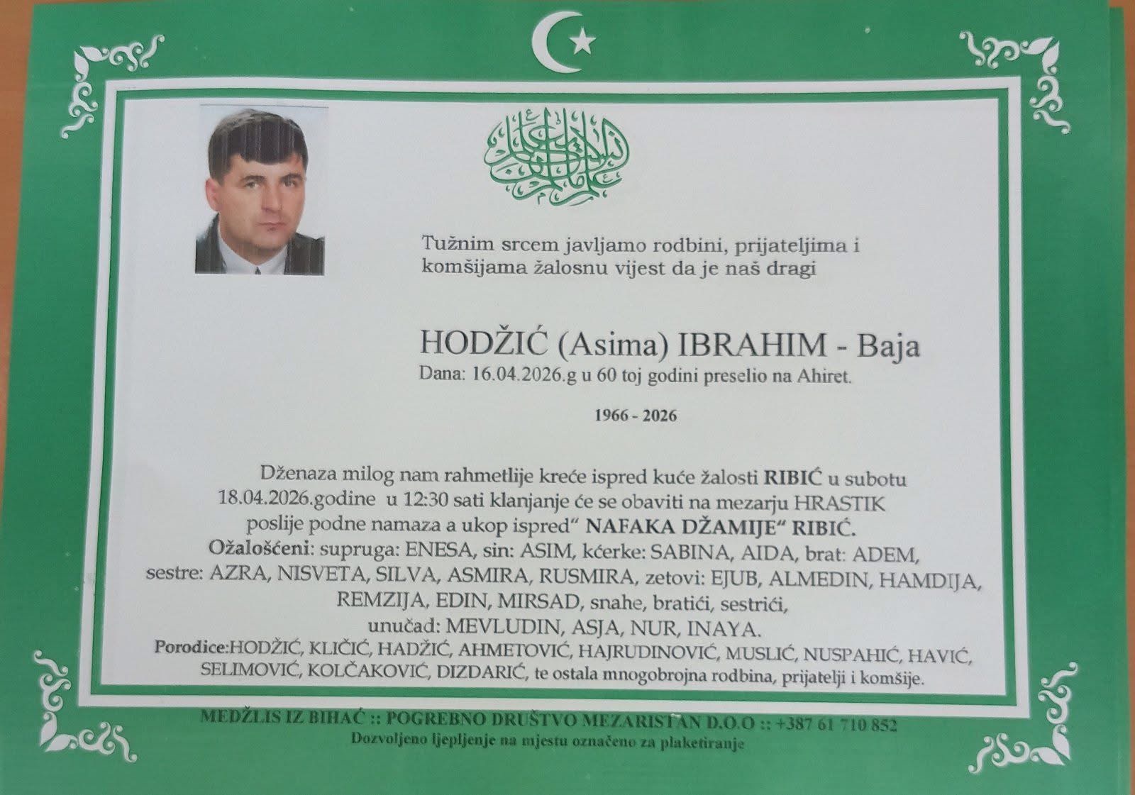 Dženaza milog nam rahmetlije kreće ispred kuće žalosti RIBIĆ u subotu 18.04.2026. godine u 12:30 sati, klanjanje će se obaviti na mezarju HRASTIK poslije podne namaza, a ukop ispred “NAFAKA DŽAMIJE” RIBIĆ.