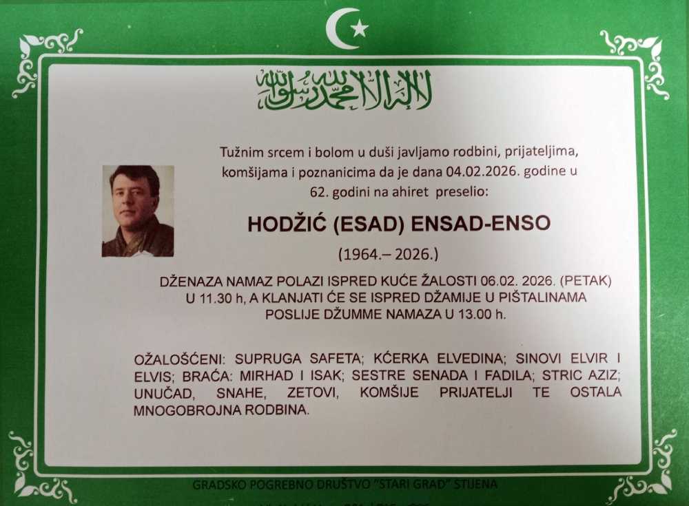 DŽENAZA NAMAZ POLAZI ISPRED KUĆE ŽALOSTI 06.02. 2026. (PETAK) U 11.30 h, A KLANJATI ĆE SE ISPRED DŽAMIJE U PIŠTALINAMA POSLIJE DŽUMME NAMAZA U 13.00 h.