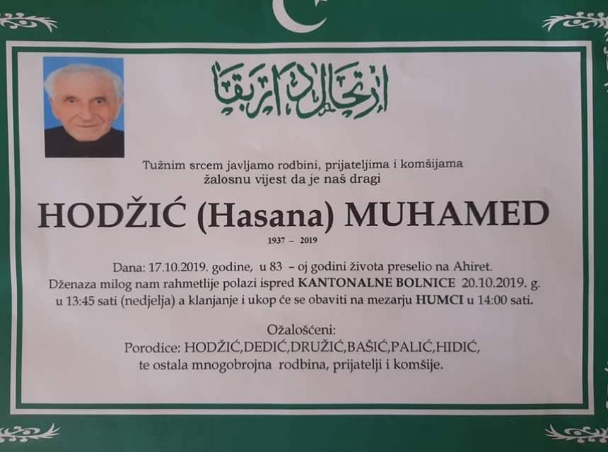 Tužnim srcem javljamo rodbini, prijateljima i komšijama žalosnu vijest da je naš dragi Hodžić (Hasana) Muhamed dana 17.10.2019. godine u 83.-oj godini života preselio na Ahiret.