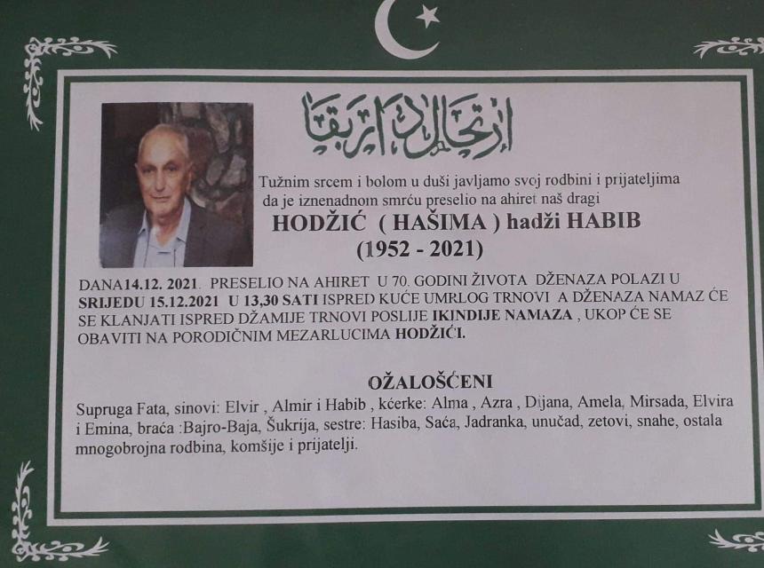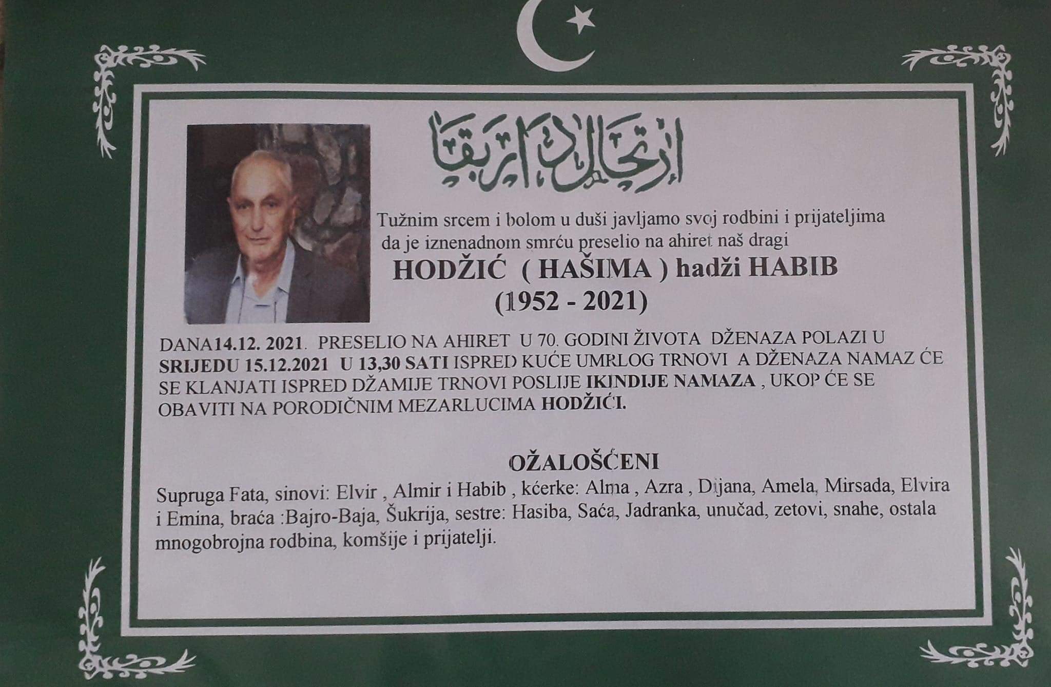 Tužnog srca i s bolom u duši obavještavamo rodbinu, komšije i prijatelje da je naš dragi Hodžić (Hašima) hadži Habib dana 14.12.2021. u 70. godini života preselio na ahiret.