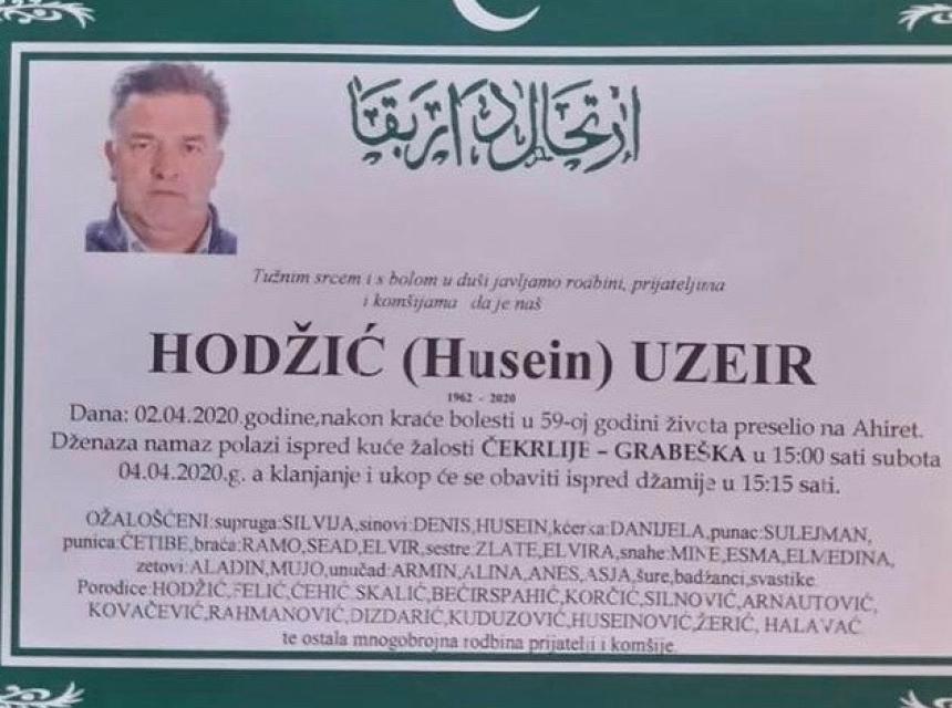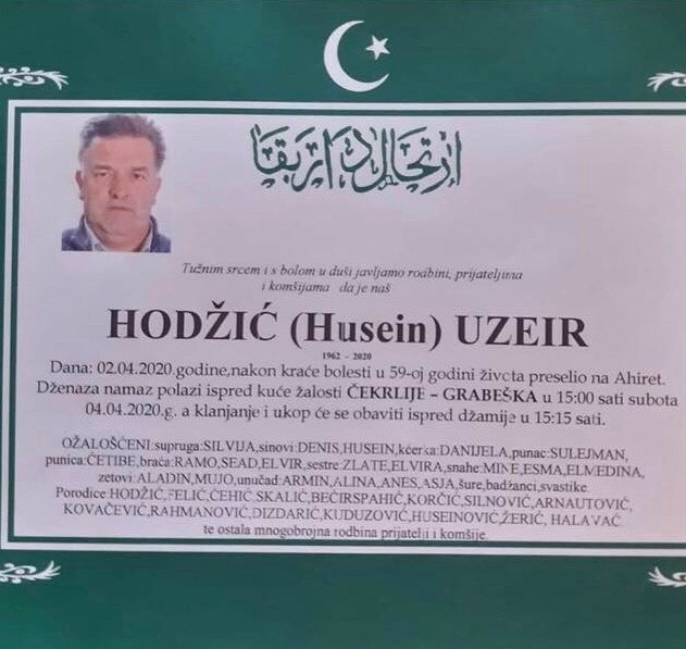 Tužnog srca i s bolom u duši javljamo rodbini, komšijama i prijateljima da je naš dragi Hodžić (Husein) Uzeir, dana 02.04.2020. godine u 59. godini života preselio na Ahiret.