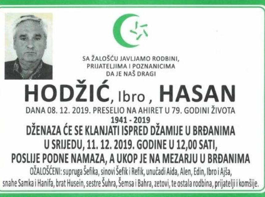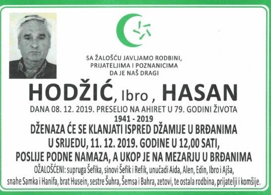 Dana 08.12.2019. u 79.oj godini života na Ahiret preselio je Hodžić (Ibro) Hasan. Dženaza će se klanjati ispred džamije u Brđanima u srijedu 11.12.2019. godine u 12:00 h, poslije podne namaza, a ukop je na mezarju u Brđanima.