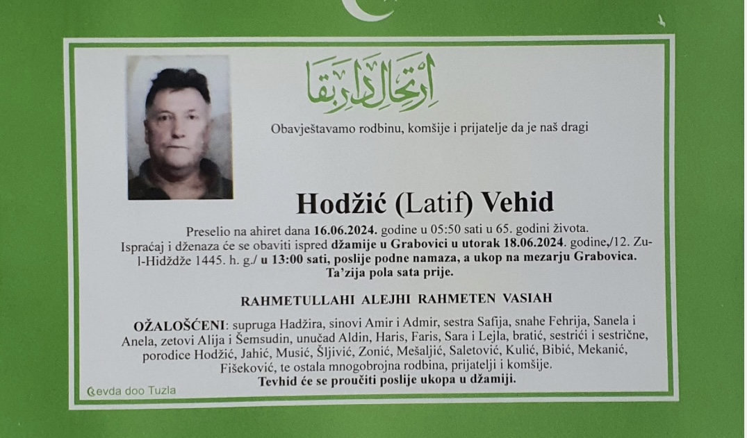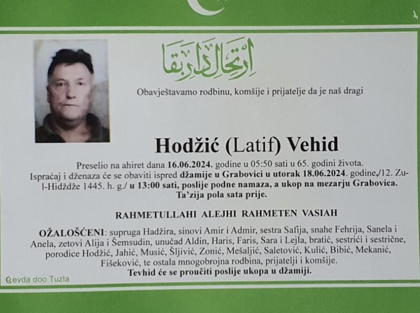 Tužnim srcem i bolom u duši javljamo rodbini, prijateljima i komšijama da je naš dragi Hodžić (Latif) Vehid, dana 16.06.2024. godine u 65-oj godini života, preselio na Ahiret.