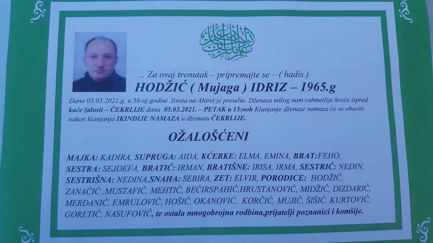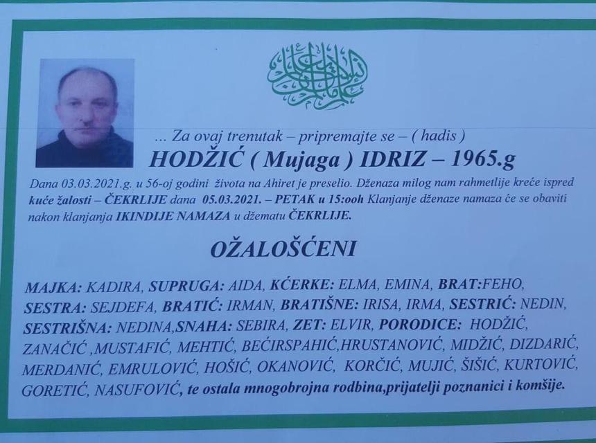Tužnog srca i s bolom u duši obavještavamo rodbinu, komšije i prijatelje da je naš dragi Hodžić (Mujaga) Idriz 03.03.2021. godine, u 56. godini života preselio na Ahiret.