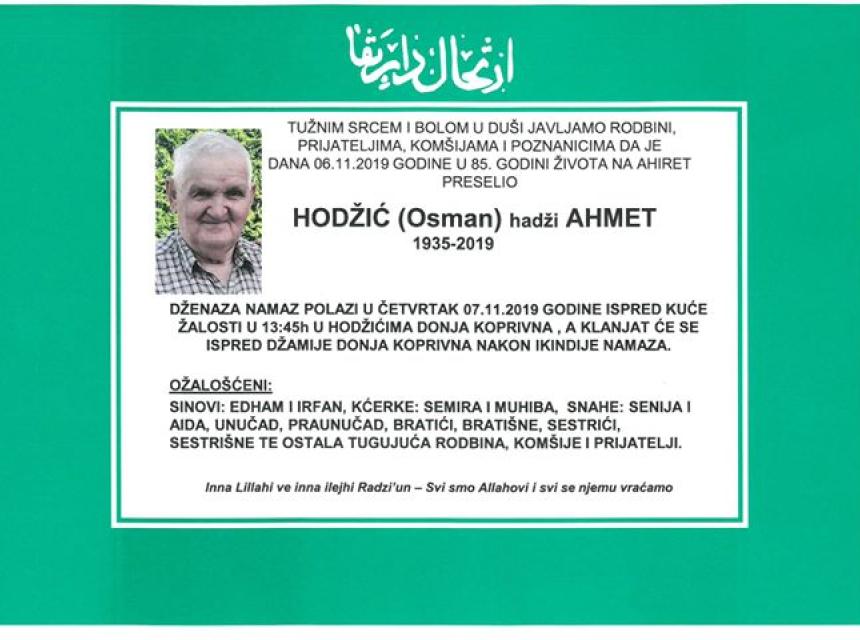 Tužnim srcem ibolom u duši javljamo rodbini, prijateljima, komšijama i poznanicima da se dana 06.11.2019. u 85. godini života na Ahiret preselio Hodžić (Osman) hadži Ahmet.