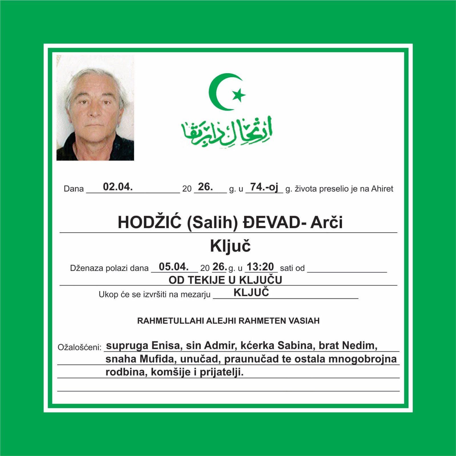 Dženaza polazi dana: 05.04.2026. u 13:20 sati od Tekije u Ključu.