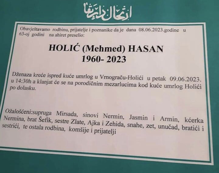Sa žalošću javljamo rodbini, prijateljima I poznanicima da je naš dragi Holić (Mehmed) Hasan preselio na Ahiret dana 08.06.2023. Godine u 63- godini života.