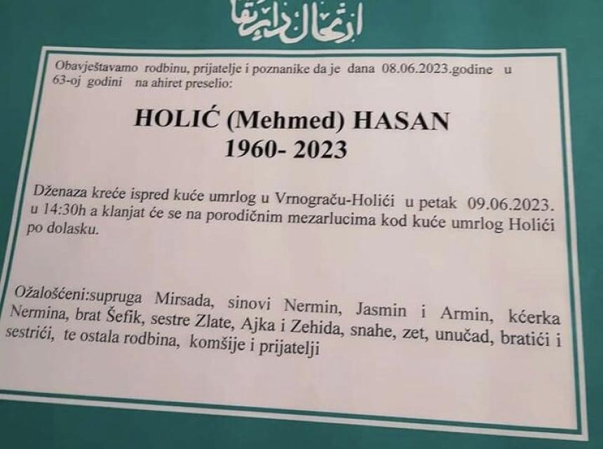 Dženaza kreće ispred kuće umrlog u Vrnograču-Holići u petak 09..06.2023 godine 14.40 sati.