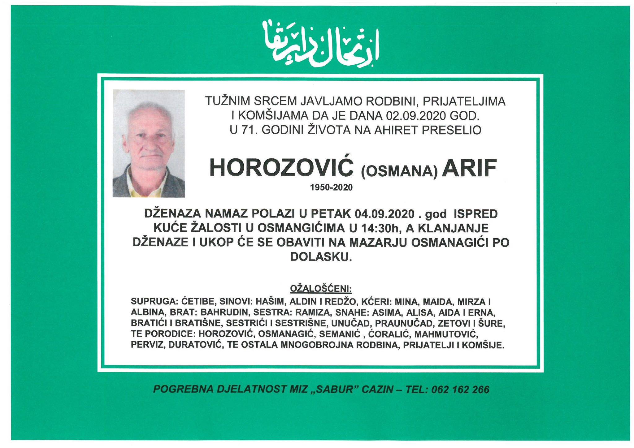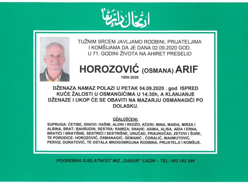 Tužnog srca i s bolom u duši obavještavamo rodbinu, komšije i prijatelje da je naš dragi Horozović (Osmana) Arif , dana 02.09.2020. godine, u 71-oj. godini života, preselio na Ahiret.