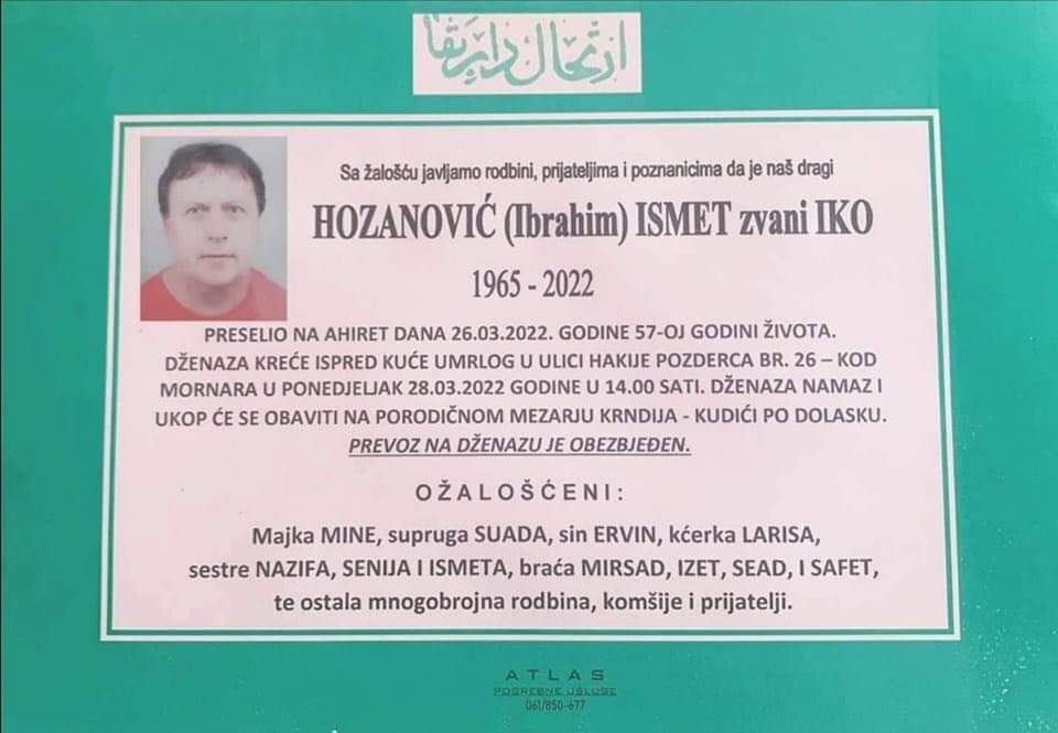 Dženaza će se obaviti u ponedjeljak 28.3.2022., na porodičnom mezarju Krndija- Kudići po dolasku.