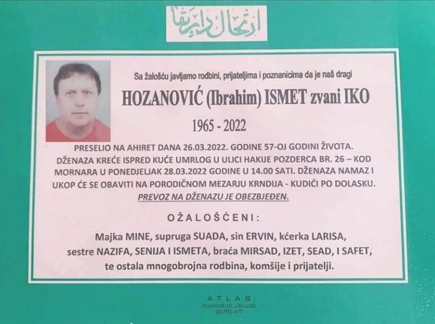 Tužnog srca i s bolom u duši obavještavamo rodbinu, komšije i prijatelje da je naš dragi Hozanović (Ibrahim) Ismet zvani Iko u 57. godini života preselio na Ahiret.