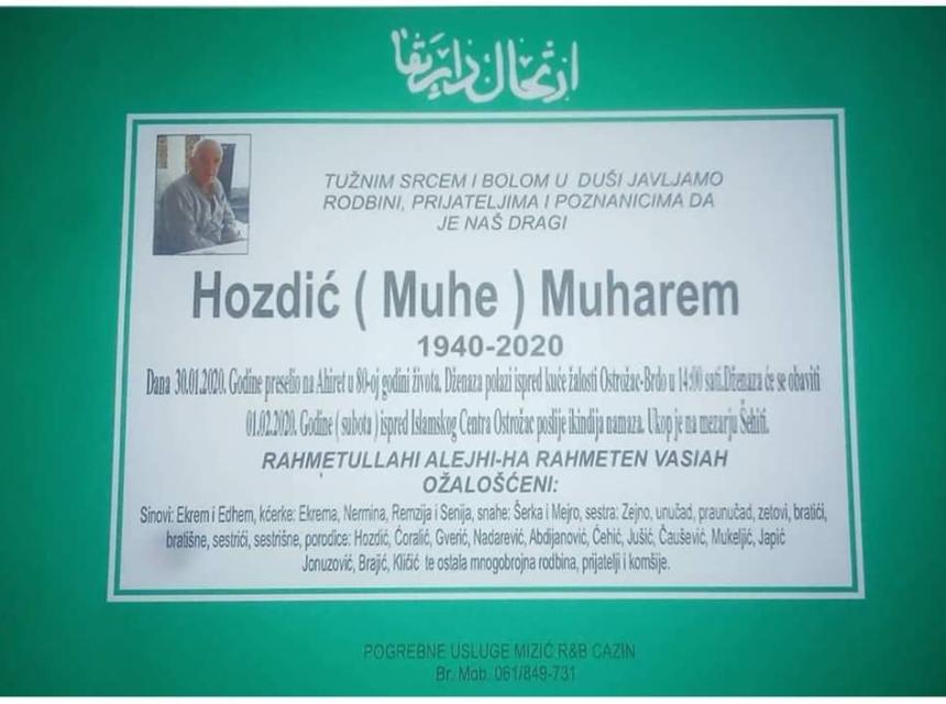 Tužnim srcem i bolom u duši javljamo rodbini i prijateljima da je dana 30.01.2020.godine u 80-oj godini života, na Ahiret preselio Hozdić (Muhe) Muharem.