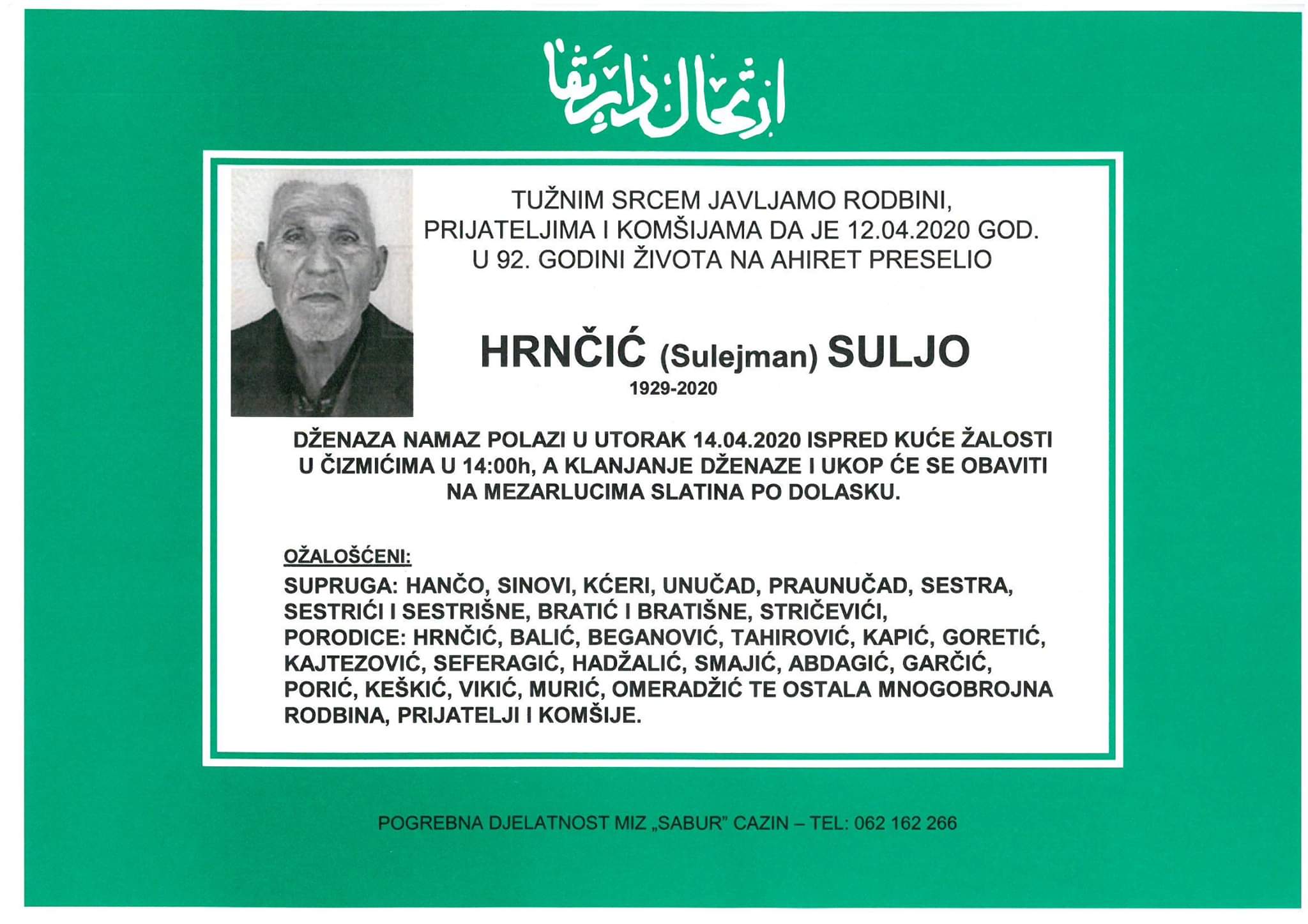 Teškim srcem i bolom u duši javljamo da je naš dragi i nikad prežaljeni Hrnčić (Sulejman) Suljo dana 12.04.2020.godine u 92-oj godini života preselio na Ahiret.