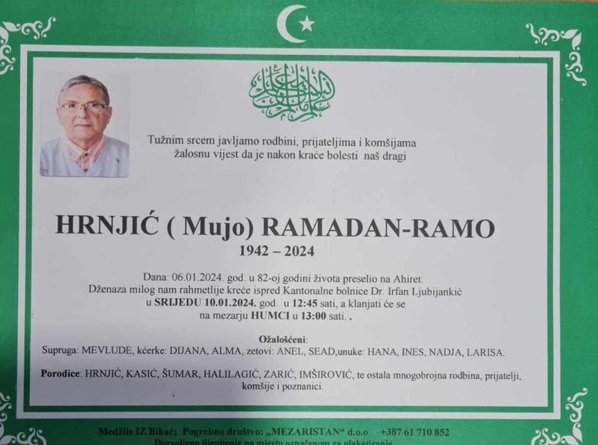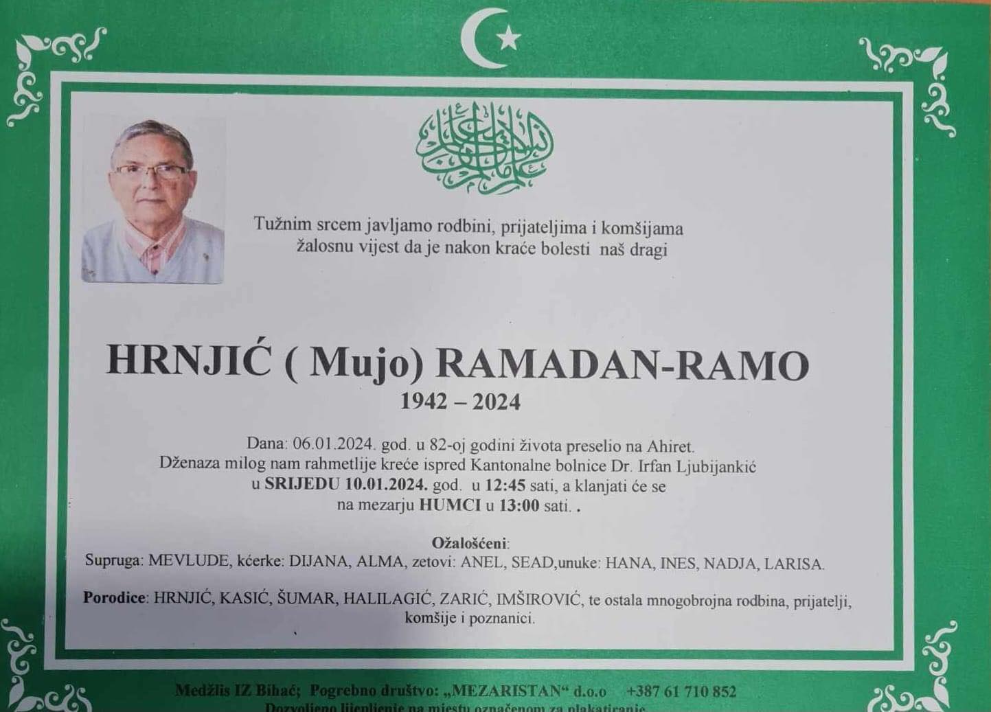 Dana 06.01.2024. godine u 82. godini života na ahiret preselio Hrnjić (Mujo) Ramadan - Ramo