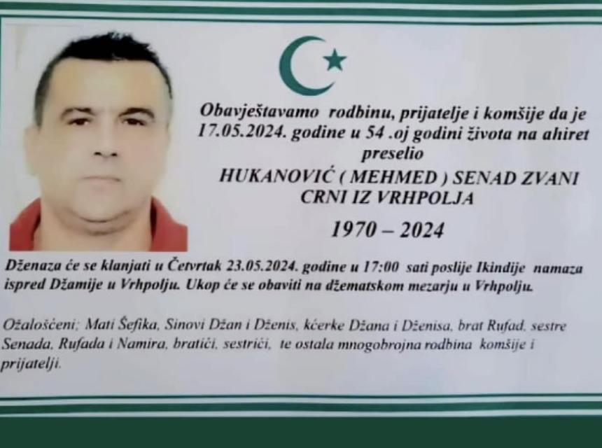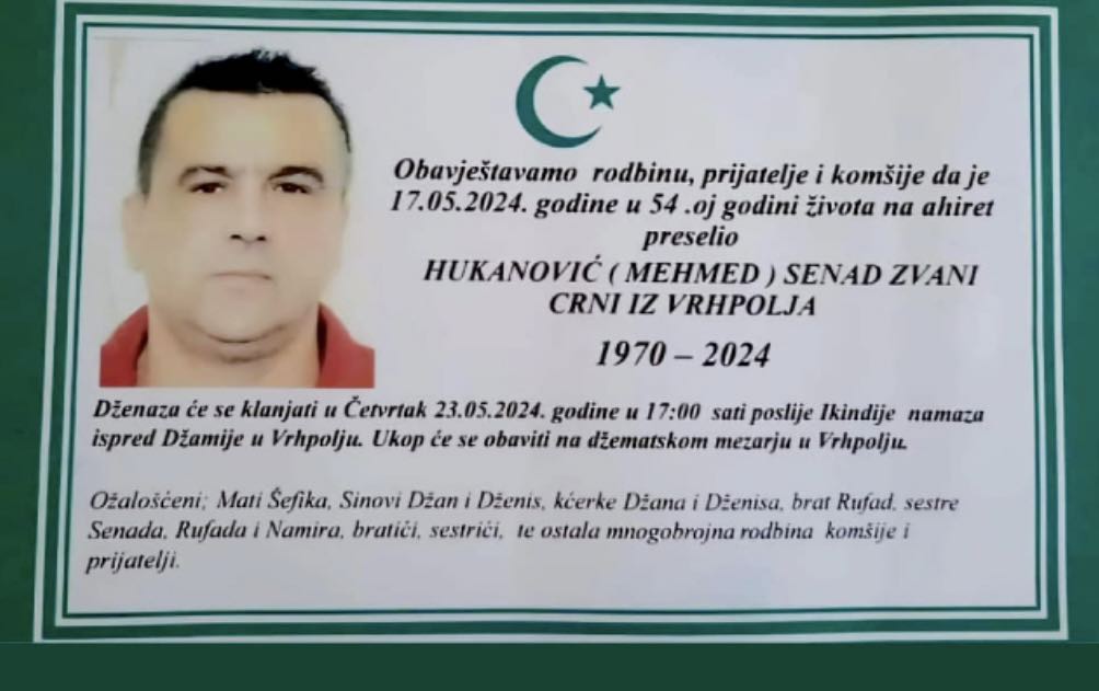 Obavještavamo rodbinu, prijatelje, poznanike i komšije da je dana 18.05.2024.god. u 54-oj godini života na Ahiret preselio Hukanović (Mehmed) Senad zvani Crni iz Vrhpolja.