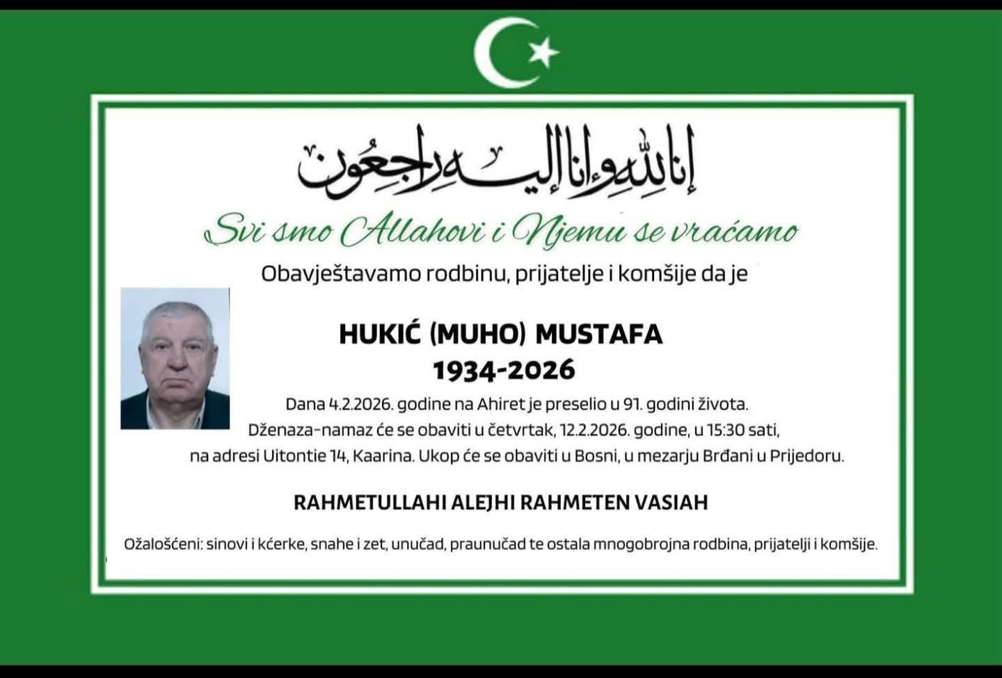 Dženaza-namaz će se obaviti u četvrtak, 12. 2. 2026. godine, u 15:30 sati, na adresi Uitontie 14, Kaarina.