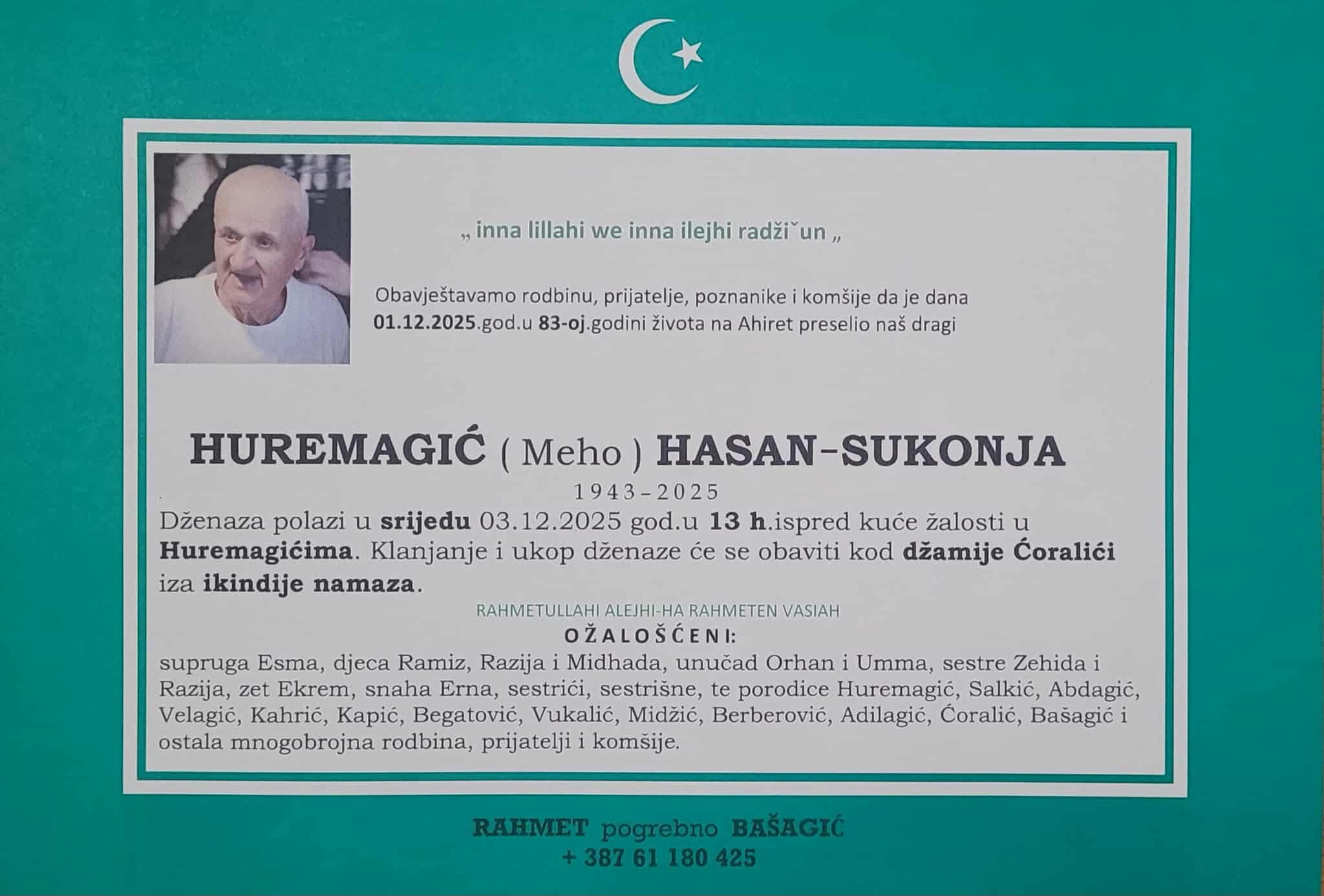 Dženaza polazi u srijedu 03.12.2025. god. u 13 h ispred kuće žalosti u Huremagićima.