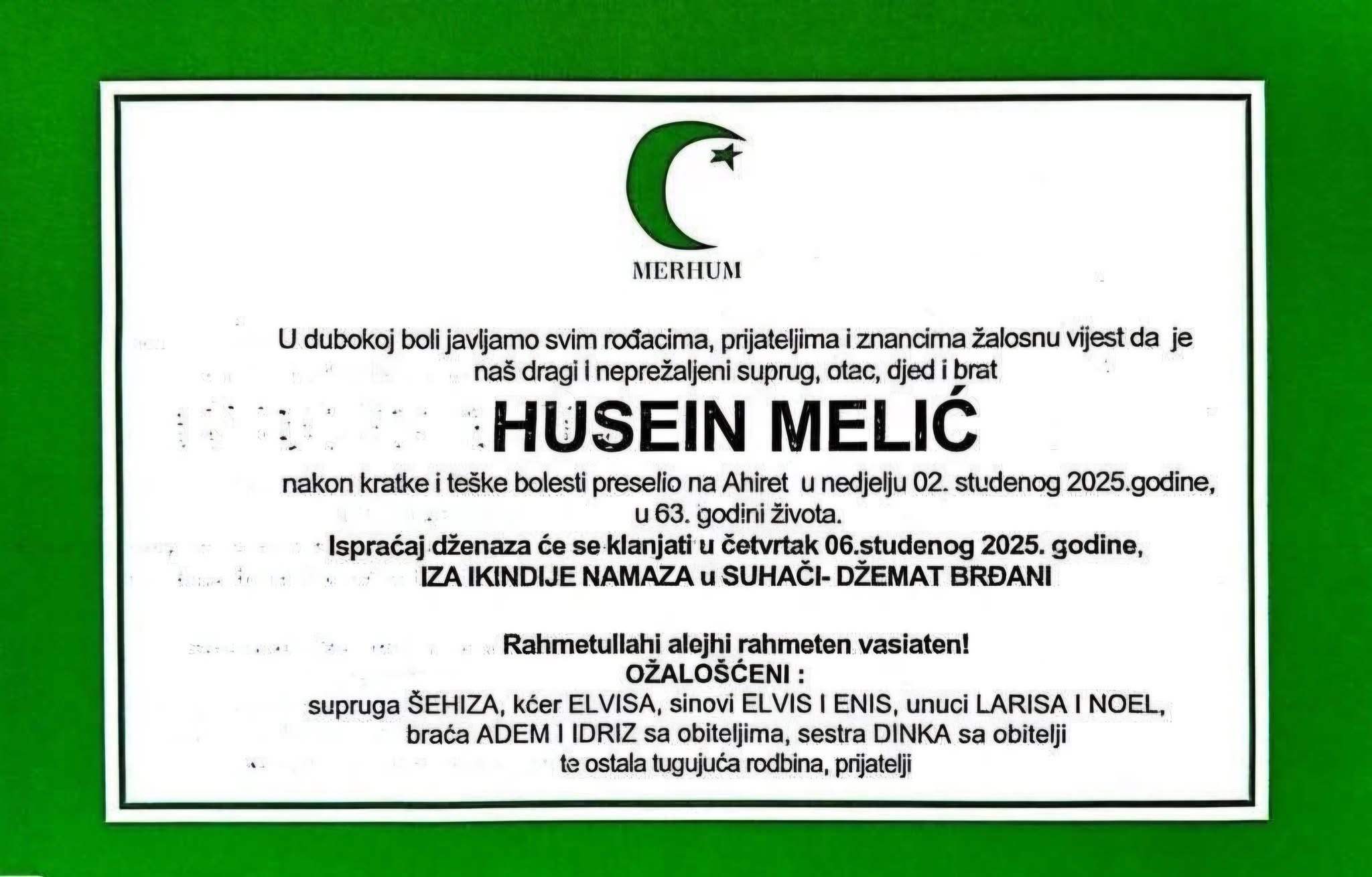 Isprćačaj dženaza će se klanjati u četvrtak 06. studenog 2025. godine, IZA IKINDIJE NAMAZA U SUHAČI – DŽEMAT BRĐANI