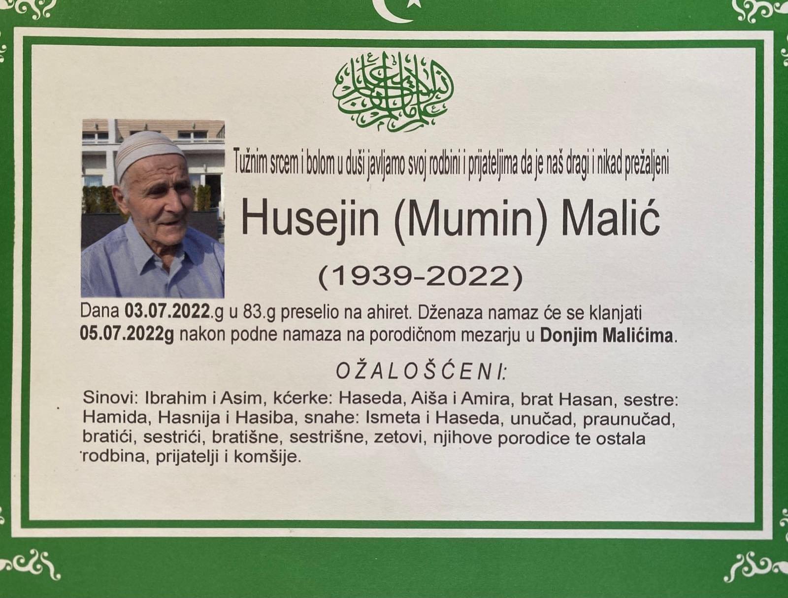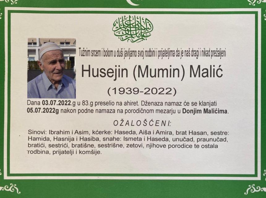 Tužnog srca i s bolom u duši obavještavamo rodbinu, komšije i prijatelje da je naš dragi Husejin (Mumin) Malić u 83. godini života preselio na Ahiret.