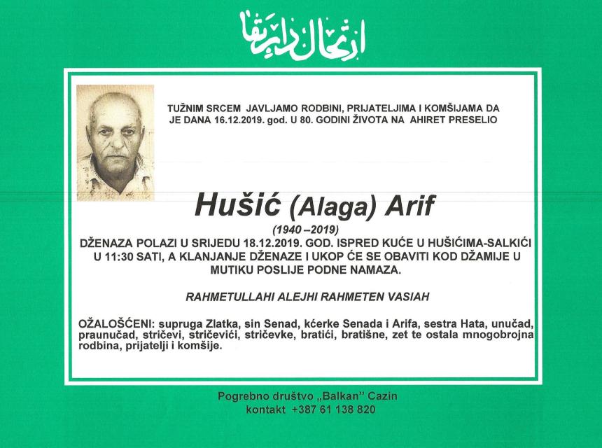 Tužnim srcem i bolom u duši javljamo rodbini i prijateljima da je dana 16.12.2019. godine u 80-oj godini života, na Ahiret preselio Hušić (Alaga) Arif. Dženaza polazi u srijedu 18.12.2019. godine ispred kuće u Hušićima, a klanjanje i ukop će se obaviti kod džamije u Mutiku poslije podne namaza.