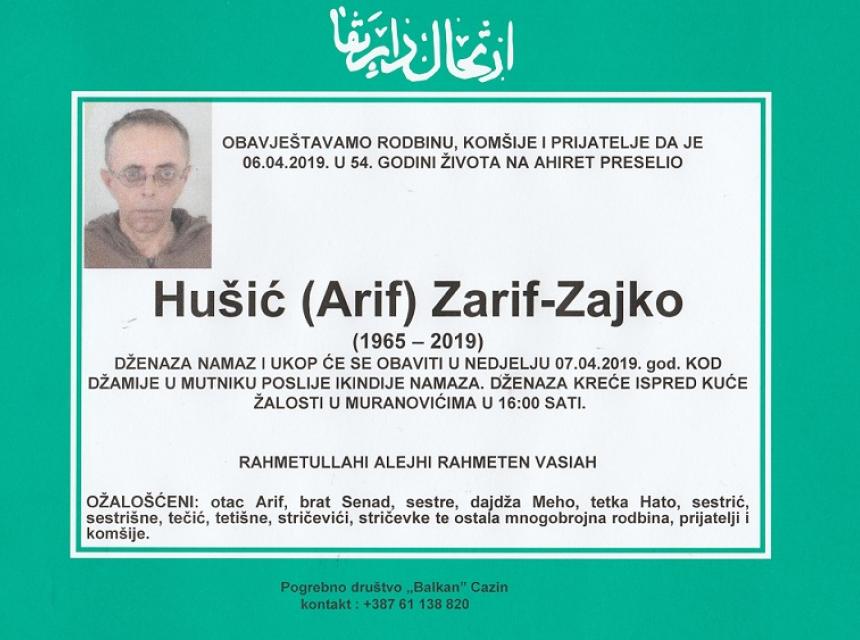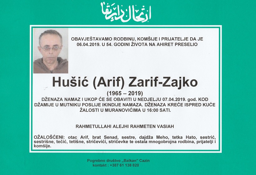 Obavještavamo rodbinu, komšije i prijatelje da je dana 06.04.2019. godine u 54.-oj godini života je na Ahiret preselio Hušić (Arif) Zarif - Zajko.