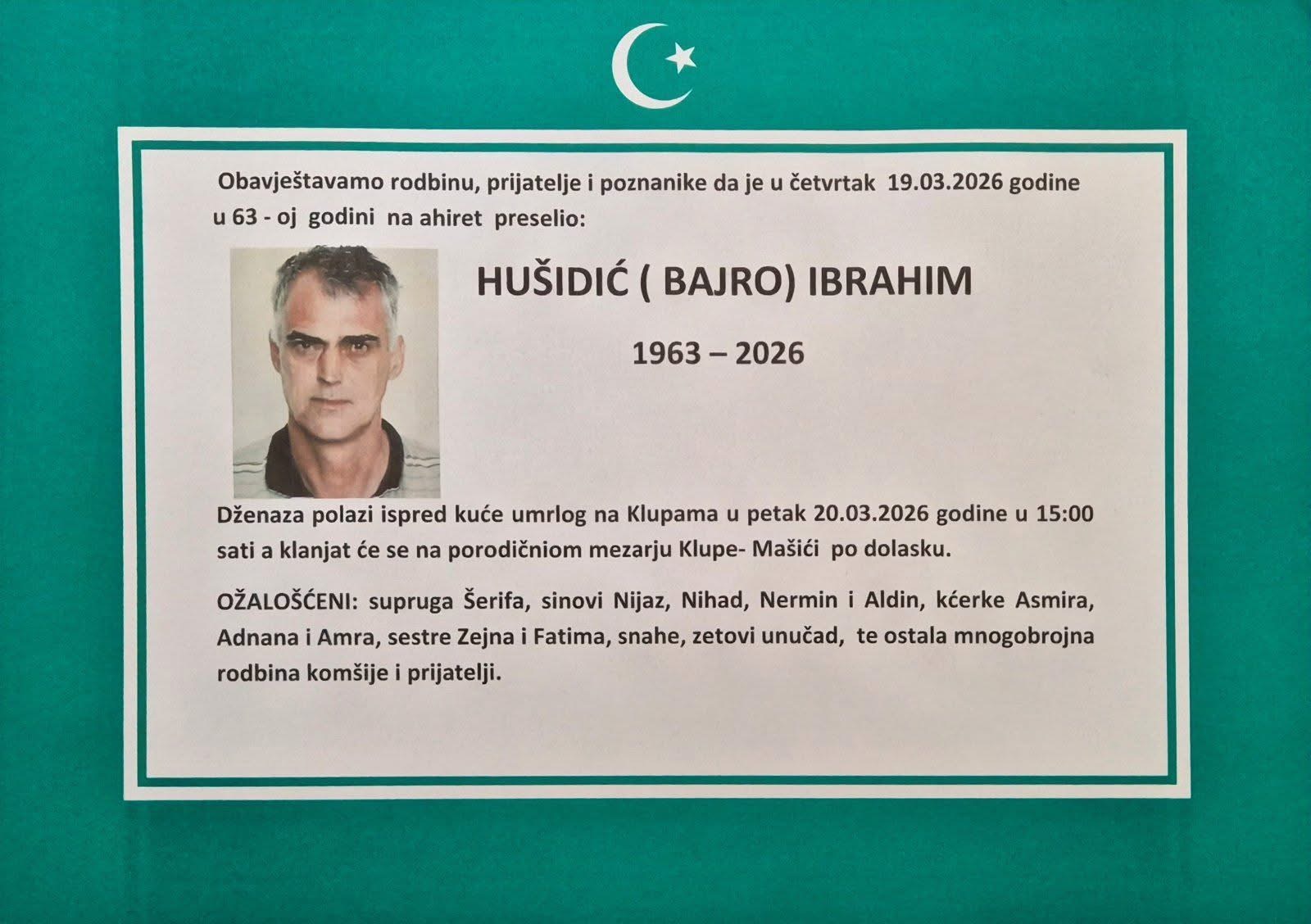 Dženaza polazi ispred kuće umrlog na Klupama u petak, 20.03.2026. godine u 15:00 sati, a klanjat će se na porodičnom mezarju Klupe – Mašići po dolasku.