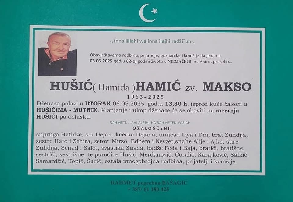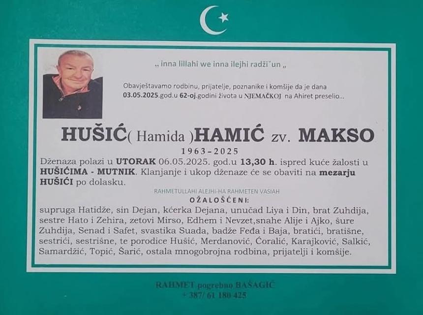 Dženaza polazi u utorak 06.05.2025. godine u 13:30h, ispred kuće žalosti u HUŠIĆIMA-MUTNIK, a klanjanje i ukop će se obaviti na mezarju HUŠIĆI po dolasku.