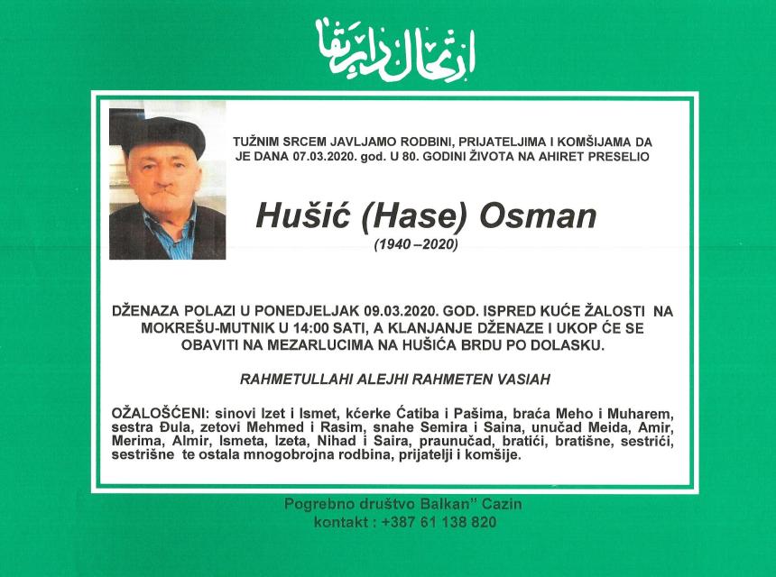 Teškim srcem i bolom u duši javljamo da je naš dragi i nikad prežaljeni Hušić (Hase) Osman dana 07. 03.2020.godine u 80. godini života preselio na Ahiret.