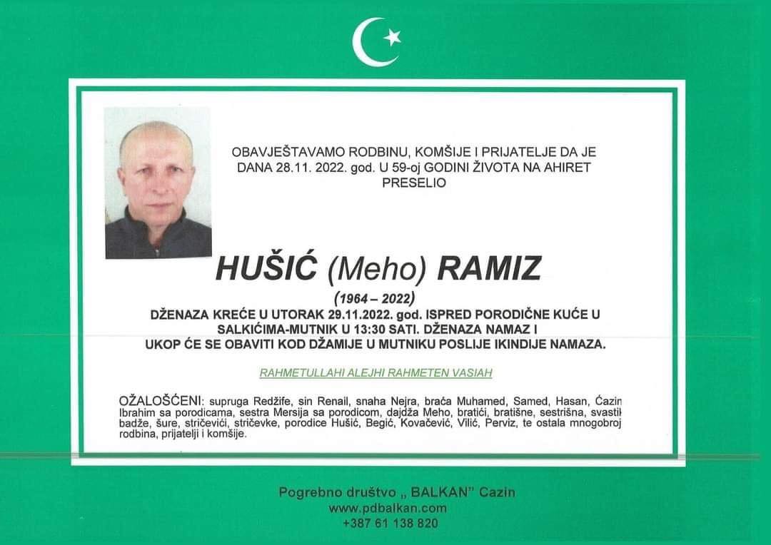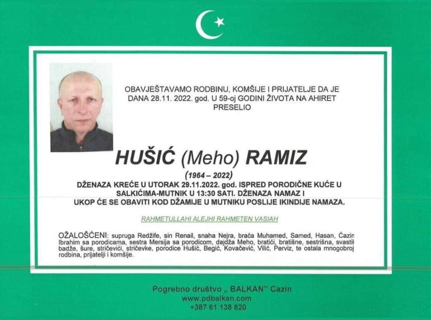 Dženaza kreće u utorak 29.11.2022. godine ispred porodične kuće u Salkićima - Mutnik u 13:30h. Dženaza namaz i ukop će se obaviti kod džamije u Mutniku poslije ikindije namaza.
