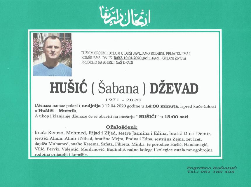 Dženaza namaz polazi u nedjelju, 12.04.2020.godine ispred porodične kuće žalosti u 14:30 sati u HUŠIĆI-MUTNIK, a klanjanje dženaze i ukop će se obaviti na mezarlucima HUŠIĆI u 15:00 sati.