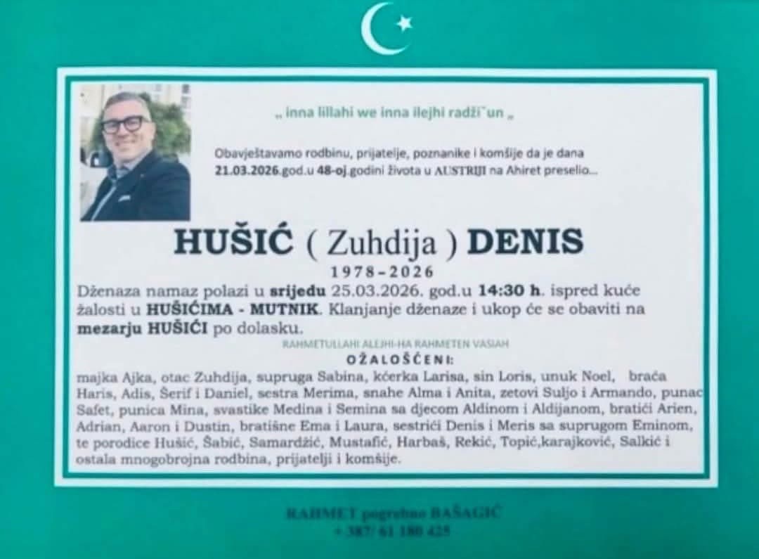 Dženaza-namaz polazi u srijedu, 25.03.2026. godine u 14:30 h ispred kuće žalosti u Hušićima – Mutnik. Klanjanje dženaze i ukop će se obaviti na mezarju Hušići po dolasku.