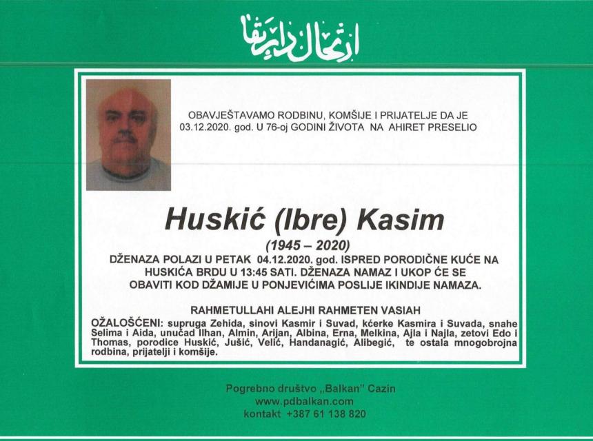 Tužnog srca i s bolom u duši obavještavamo rodbinu, komšije i prijatelje da je naš dragi Huskić (Ibre) Kasim 03. decembra 2020. godine, u 76. godini života preselio na Ahiret.
