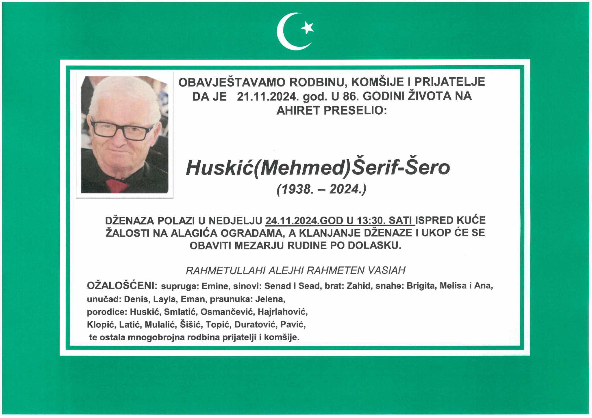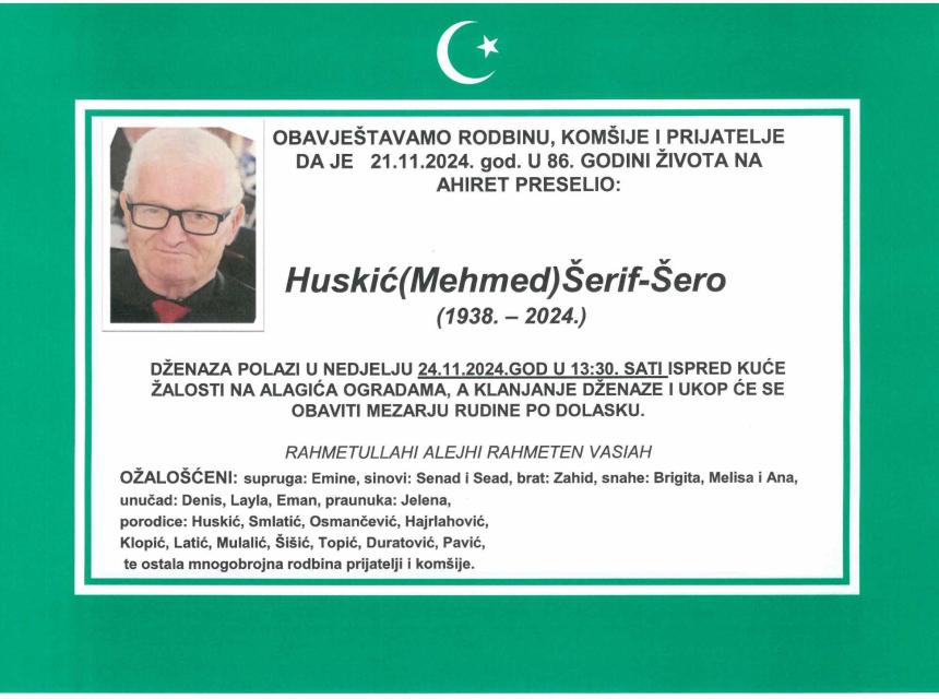Tužnim srcem obavještavamo rodbinu, prijatelje i komšije da je dana 21.11.2024. god. u 86-oj godini života na ahiret preselio Huskić (Mehmed) Šerif- Šero.