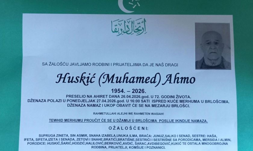 DŽENAZA POLAZI U PONEDJELJAK 27.04.2026.god. U 16:00 SATI ISPRED KUĆE MERHUMA U BRLOŠCIMA.