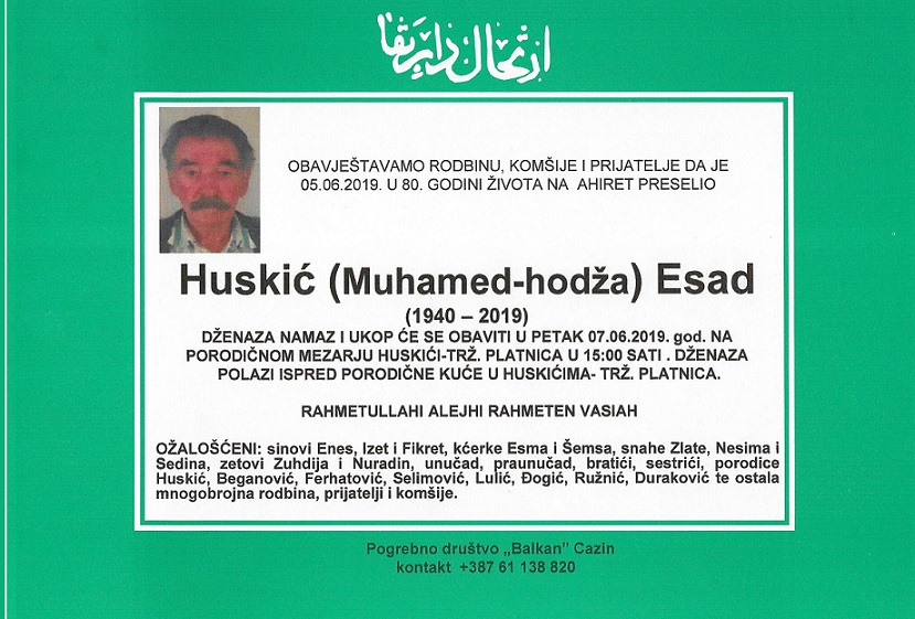 Obavještavamo rodbinu, komšije i prijatelje da je 05.06.2019, godine u 80. godini života na Ahiret preselio Huskić (Muhamed-hodža) Esad.