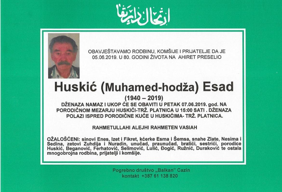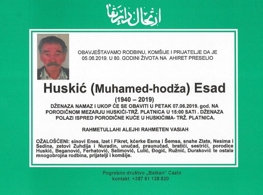 Dženaza namaz i ukop će se obaviti u petak 07.06.2019. godine na porodičnom mezarju Huskići - Tržačka Platnica u 15:00 sati, a dženaza polazi ispred porodične kuće u Huskićima - Tržačka Platnica.