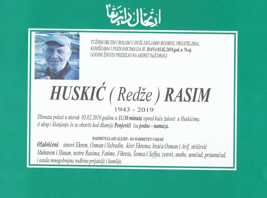 Tužnim srcem i bolom u duši Vam javjamo da je 03.02.2019.g. u 76.-oj godini na Ahiret preselio Huskić (Redže) Rasim.