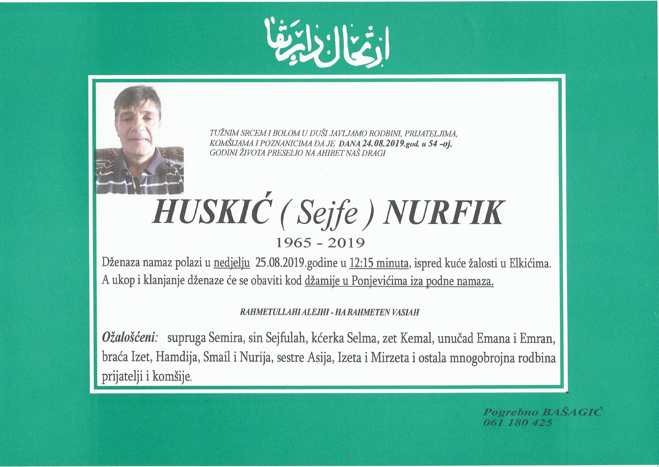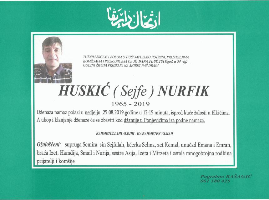 Tužnim srcem i bolom u duši javljamo rodbini, prijateljima, komšijama i poznanicima da je dana 24.08.2019.god. u 54.-oj. godini života preselio na Ahiret naš dragi Huskić (Sejfe) Nurfik.