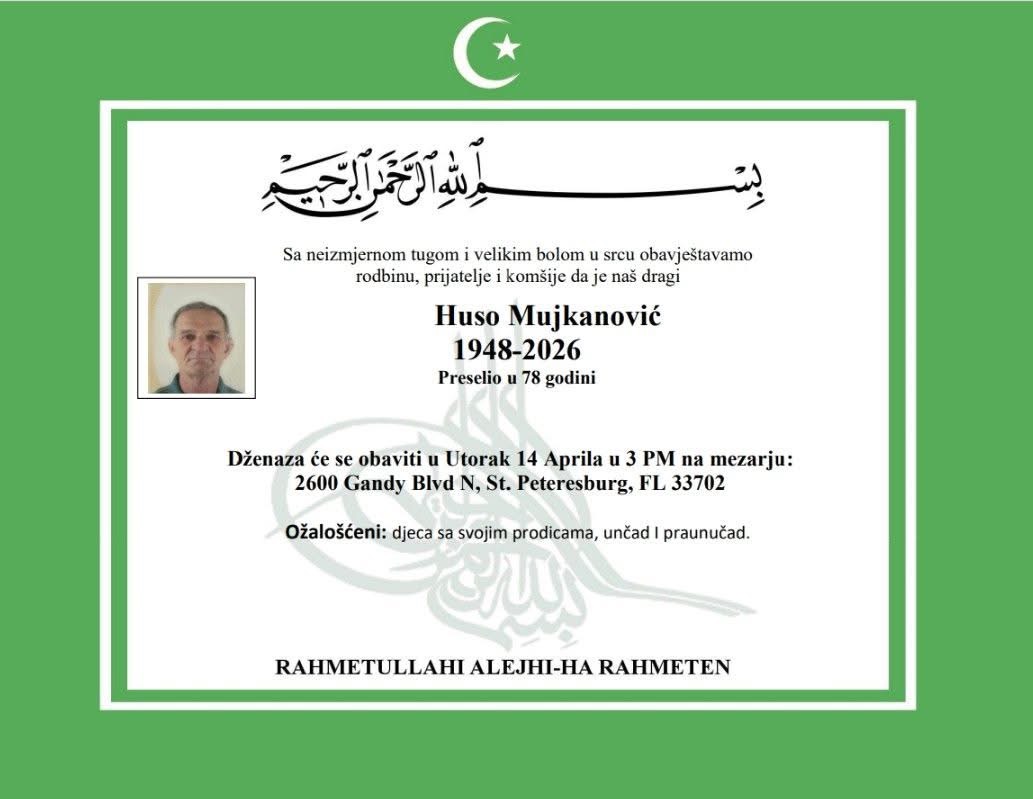 Dženaza će se obaviti u utorak, 14. aprila u 3 PM na mezarju: 2600 Gandy Blvd N, St. Petersburg, FL 33702