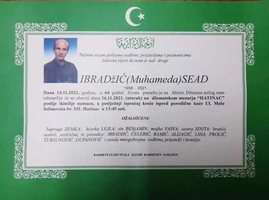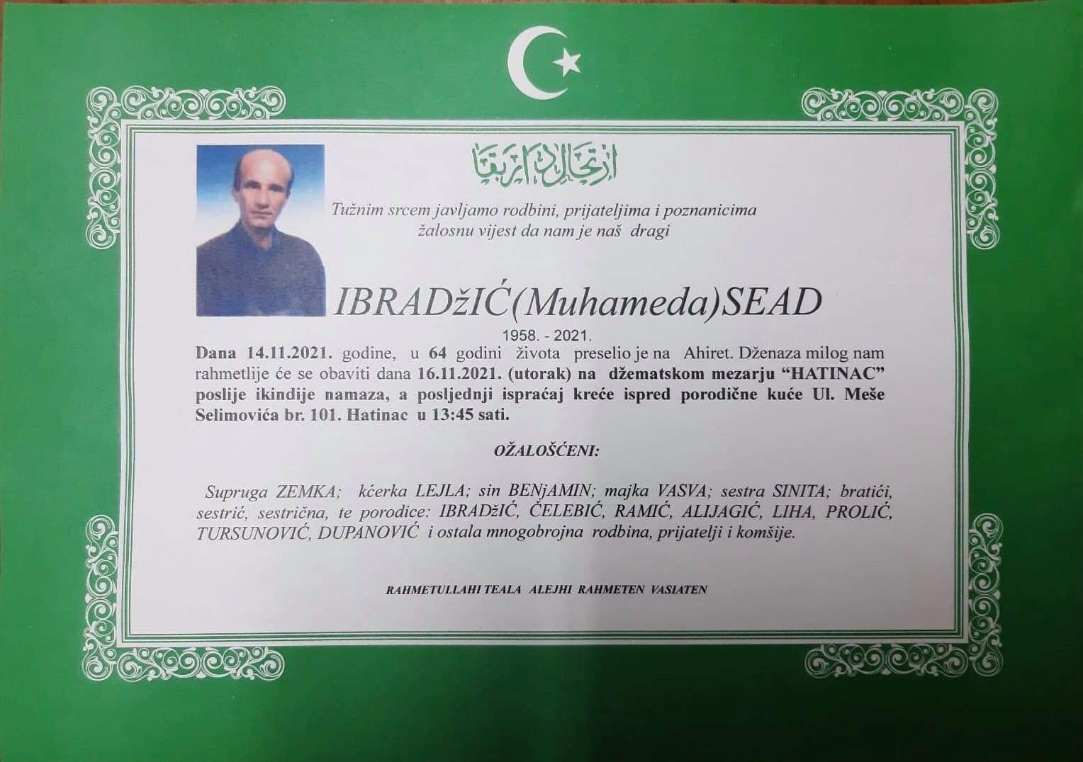 Tužnog srca i s bolom u duši obavještavamo rodbinu, komšije i prijatelje da je naš dragi Ibradžić (Muhameda) Sead dana 14.11.2021. u 64. godini života preselio na ahiret.