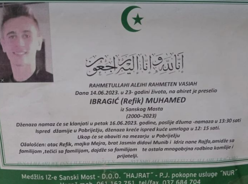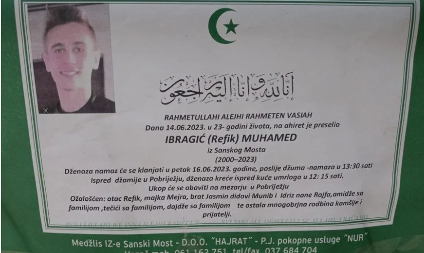 Tužnim srcem i bolom u duši javljamo rodbini, prijateljima i komšijama da je naš dragi Ibragić (Refik) Muhamed , u 23-oj godini života, preselio na Ahiret, dana 14.6.2023.godine