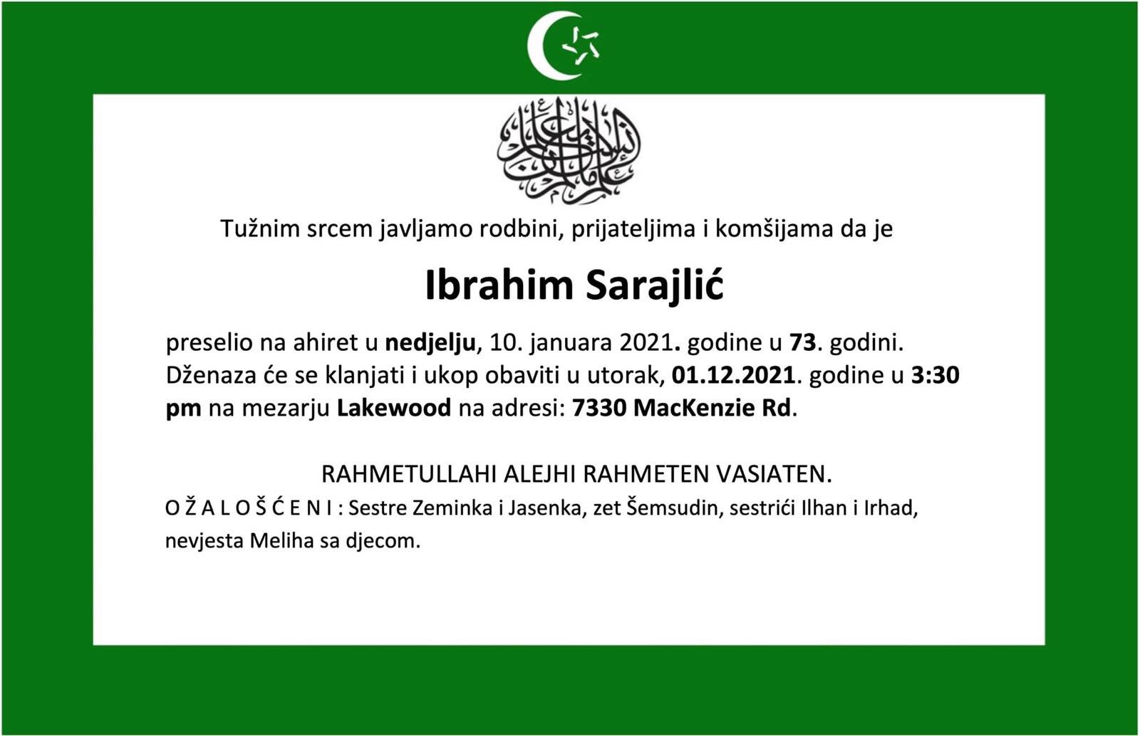 Tužnog srca i s bolom u duši obavještavamo rodbinu, komšije i prijatelje da je naš dragi Ibrahim Sarajlić , dana 10.01.2021. godine, u 73-oj. godini života, preselio na Ahiret.