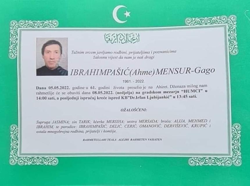 Tužnog srca i s bolom u duši obavještavamo rodbinu, komšije i prijatelje da je naš dragi Ibrahimpašić (Ahme) Mensur - Gago u 61. godini života preselio na Ahiret.