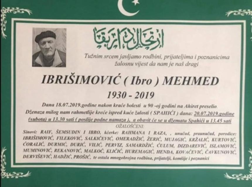 Tužnim srcem i bolom u duši javljamo rodbini, prijateljima i komšijama da je dana 18.07.2019. godine u 90. godini života na Ahiret preselio Ibrišimović ( Ibro ) Mehmed.