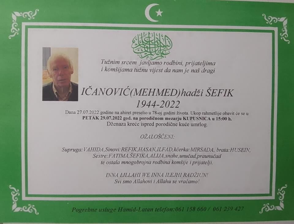 Dženaza namaz kreće ispred porodične kuće 29.07.2022. god., a ukop će se obaviti u 15:00h na porodičnom mezarju Kupusnica.